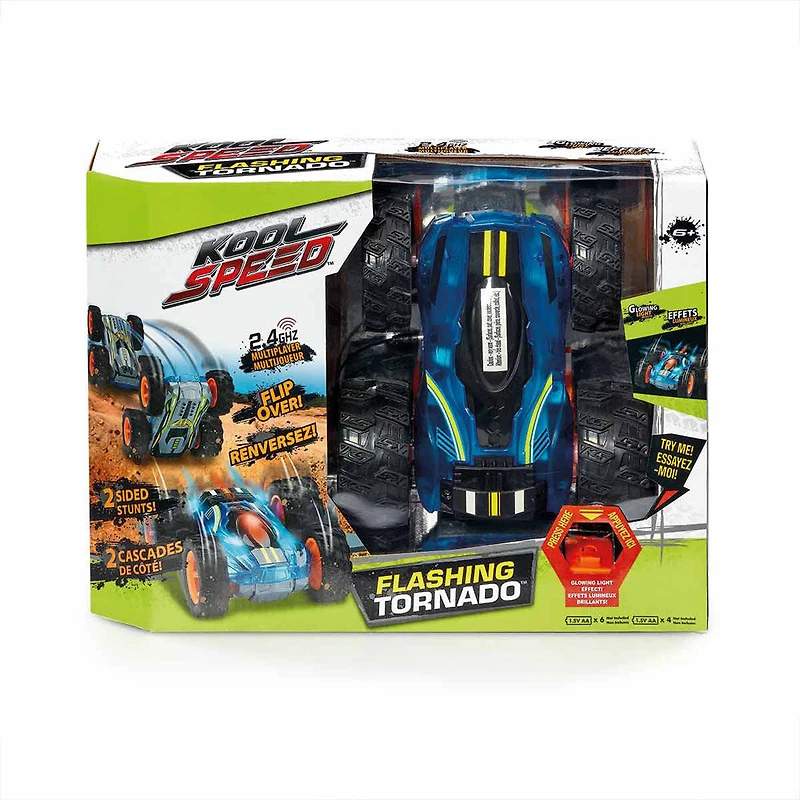 Notre exclusivité, disponible seulement chez Toys"R"Us Canada. Allez vite, coursez et faites des sauts périlleux avec votre voiture téléguidée Flashing super-cool. Avec une fréquence de 2,4 GHz, vous pouvez jouer avec cette excitante voiture téléguidée avec plusieurs joueurs et effectuer des cascades à 2 faces. Regardez le véhicule s'illuminer avec des lumières incandescentes et se retourner pendant que vous la contrôlez. Vous êtes sûr de développer des astuces géniales! Convient aux enfants de 6 ans et plus. Piles non incluses. Nécessite 10 piles AA.