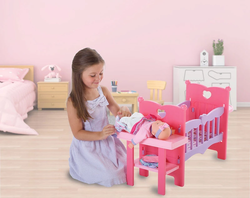 Plaisir tout en un. Comprend une chaise haute, un berceau et une table à langer. Convient aux poupées de 30,5 cm à 40,6 cm. Assemblage par encliquetage. Dimensions assemblées: 50,8 cm de largeur x 44,5 cm de hauteur x 43,2 cm de profondeur.