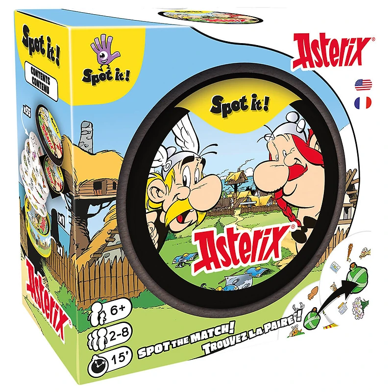 Cette nouvelle version de Spot it! combine vos personnages préférées du monde d'Astérix avec l'un des jeux familiaux les plus emblématiques. Les joueurs tentent de repérer le seul symbole correspondant entre 2 cartes dans une bataille ludique d'observation rapide. Retrouvez les personnages et objets iconiques de l'univers d'Astérix sur 55 cartes illustrées! Défendez le village gaulois en tapant sur les romains dans le mini jeu exclusif : La Bagarre!