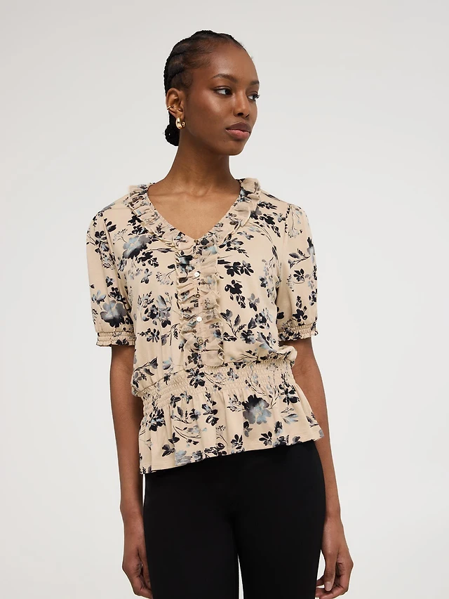 Robe à motifs floraux ornée dun ourlet asymétrique et de volants