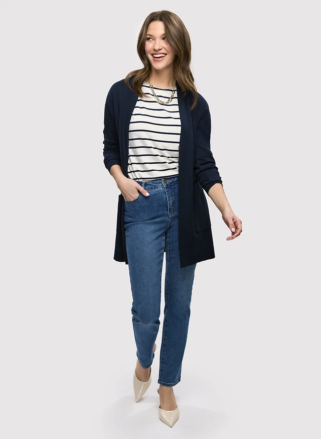 Cardigan mi-long et jean à jambe droite