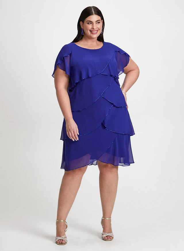 Robe à bords scintillants et boucles d'oreilles croisées