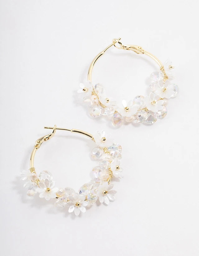 Boucles d’oreilles en forme de cerceau en fleurs perlées dorées