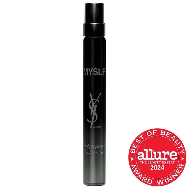 Eau de parfum MYSLF en vaporisateur de voyage avec un accord frais et des notes de bois chauds.