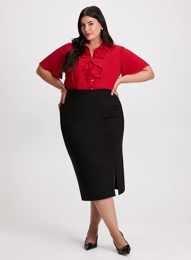 Blouse à manches courtes et volants et jupe crayon midi