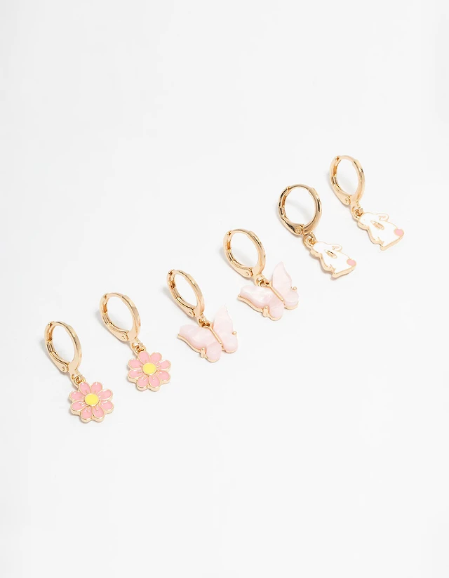 Pack de 3 boucles d’oreilles Huggie Gold Bunny & Butterfly pour enfants