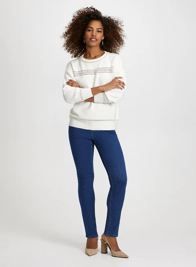 Pull ras-du-cou à perles et paillettes et jean à enfiler