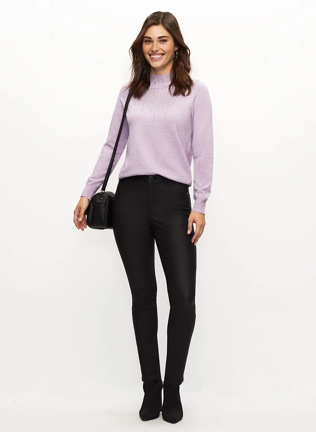 Pull à col montant et lien à nouer avec jean bleu étroit