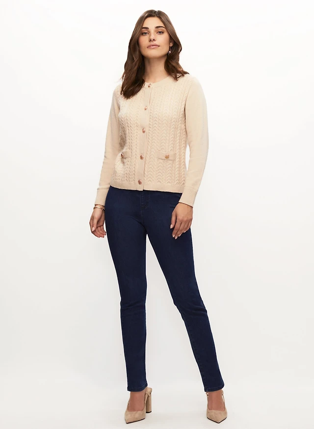 Cardigan boutonné avec boucles d'oreilles ovales et jean droit