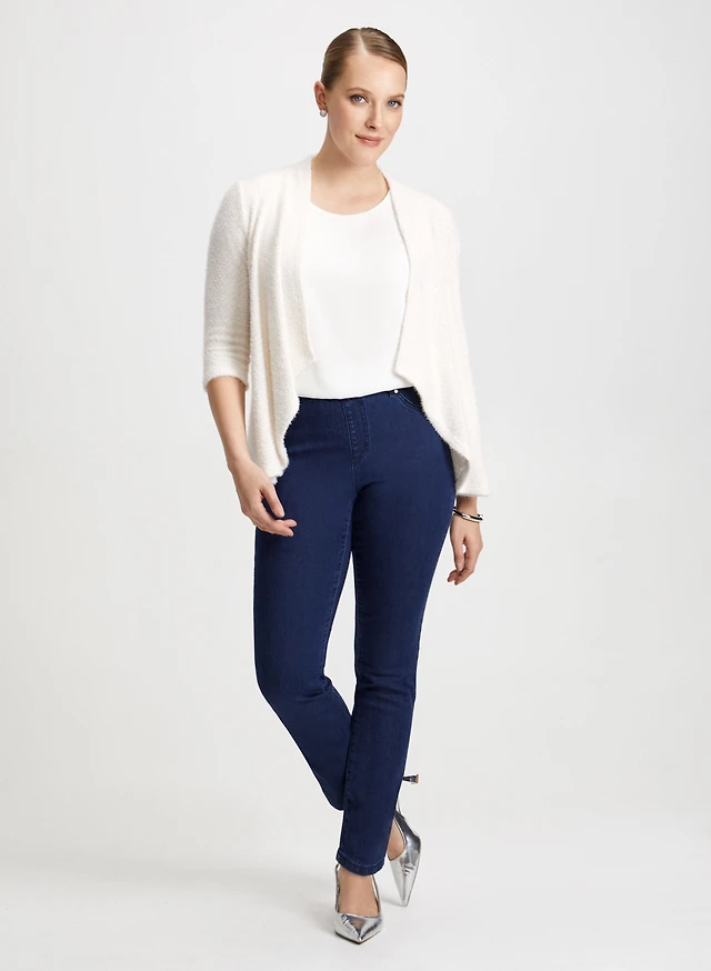 Cardigan en tricot ouvert et jean à ourlet festonné