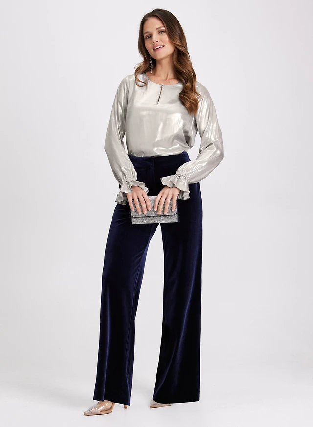 Blouse métallique à poignets évasés et pantalon Olivia en velours