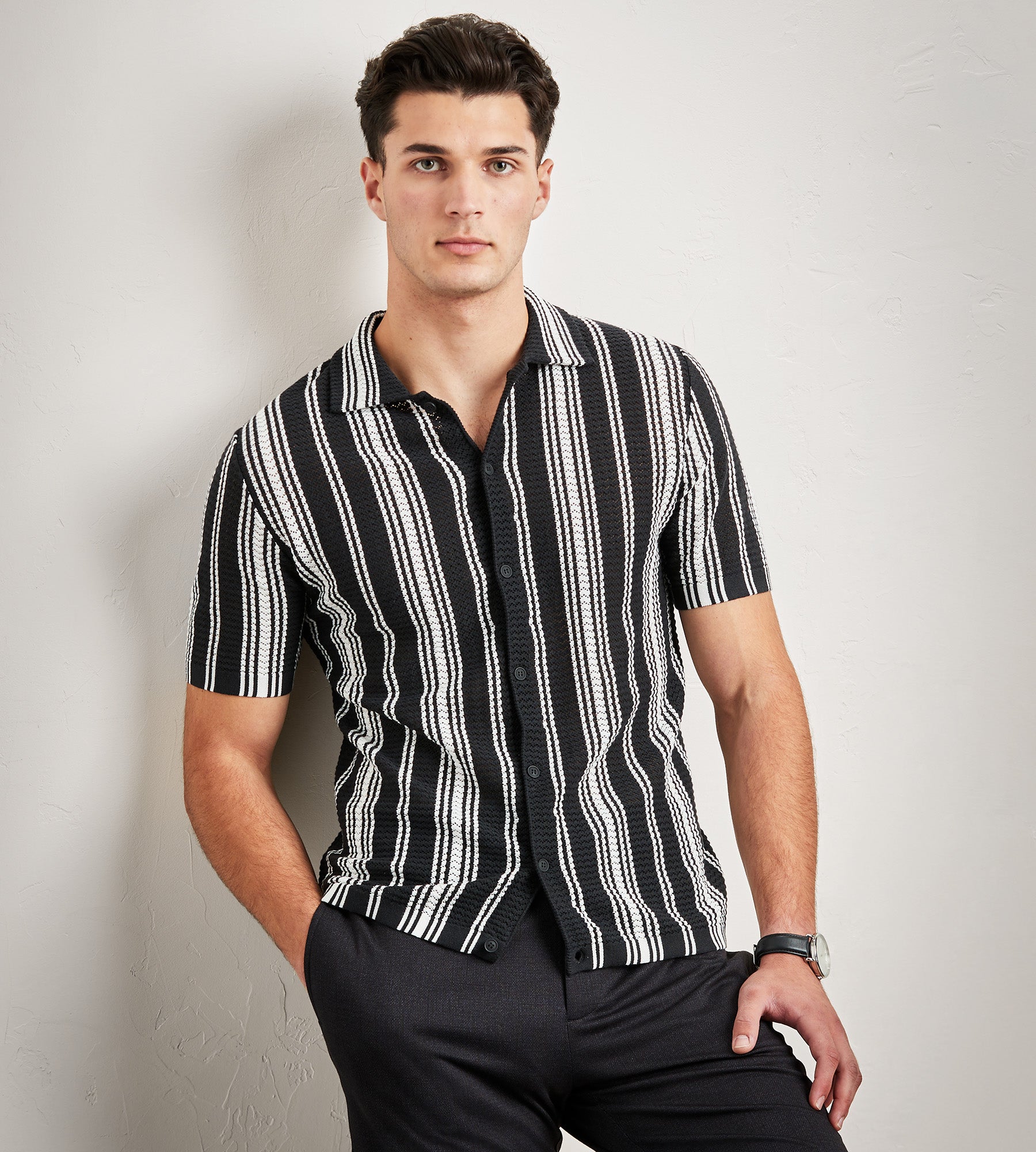 Short Sleeve Modern Fit Sweater Knit Striped Pattern Casual Shirt