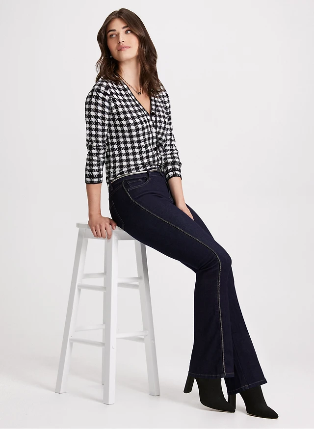 Cardigan à motif pied-de-poule et jean à jambe évasée