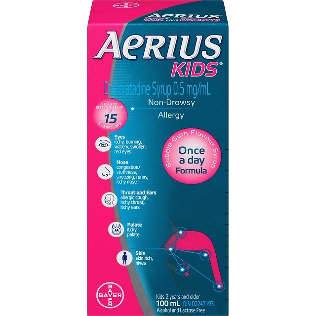 Aerius Kids, Allergy Medicine, 24-Hour Non-Drowsy Relief Syrup, 15 Symptoms, Bubble Gum Flavour, 100 mL