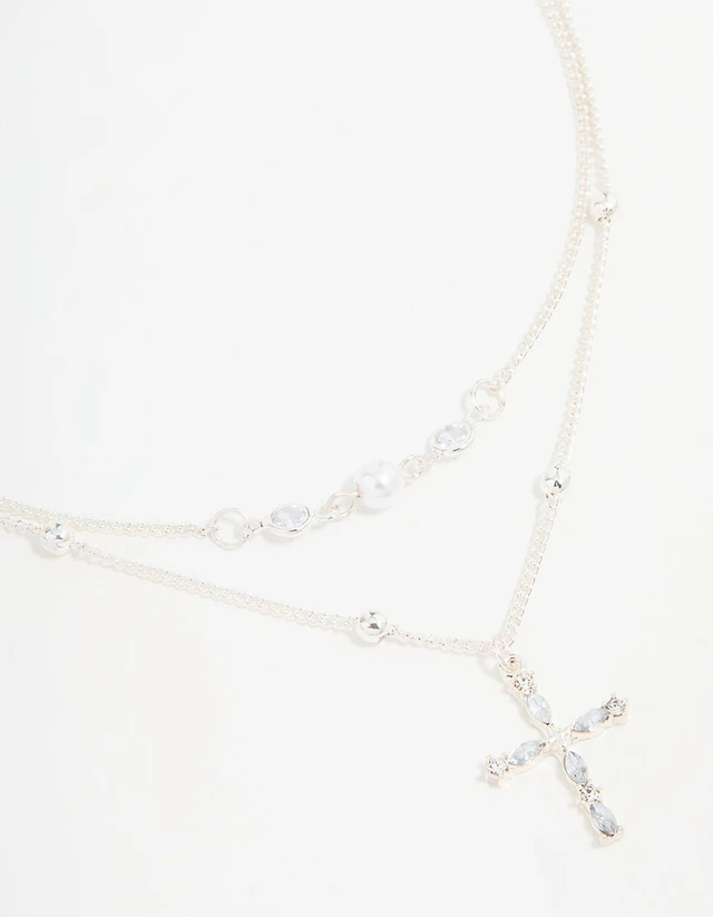 Silver Beaded Diamante Cross Layered Necklace