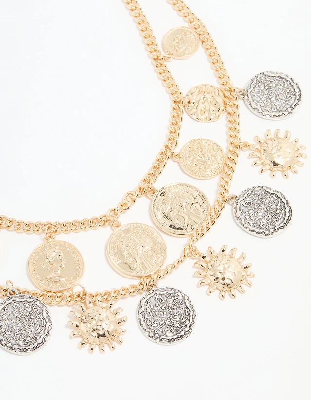 Gold Plated Brass Cubic Zirconia Cross Coin Layered Necklace