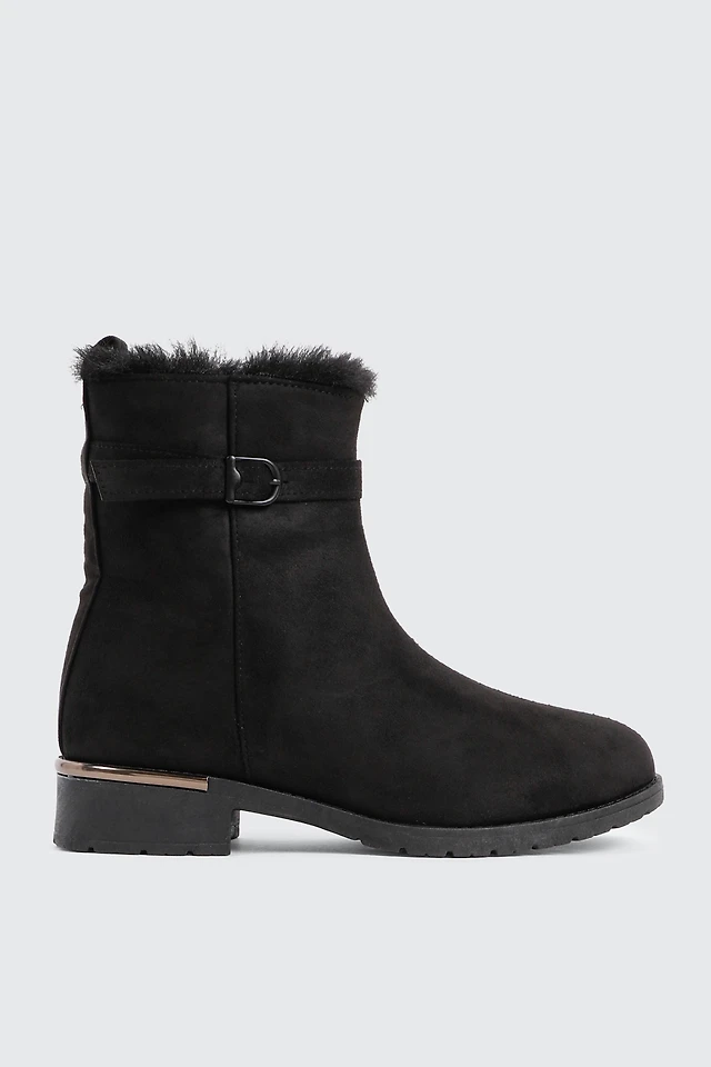 Ardene Faux Sheepskin Ankle Boots with Accent Trim in Black | Size | Faux Suede | Eco-Conscious