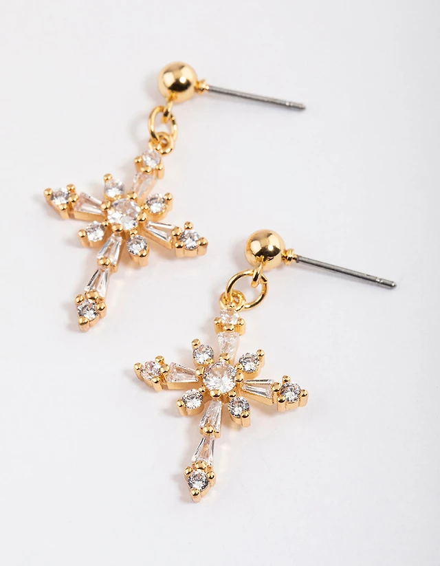 Gold Plated Cubic Zirconia Ornate Cross Drop Earrings