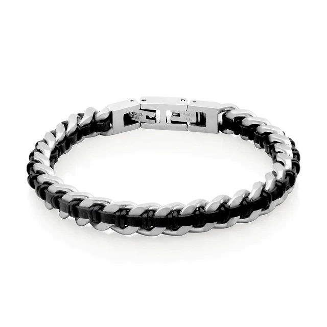 STEELX Stainless Steel Black Leather Curb Chain Bracelet