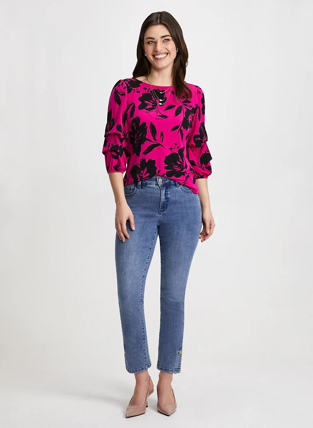 Pinched Sleeve Floral Print Top & Button Hem Jeans