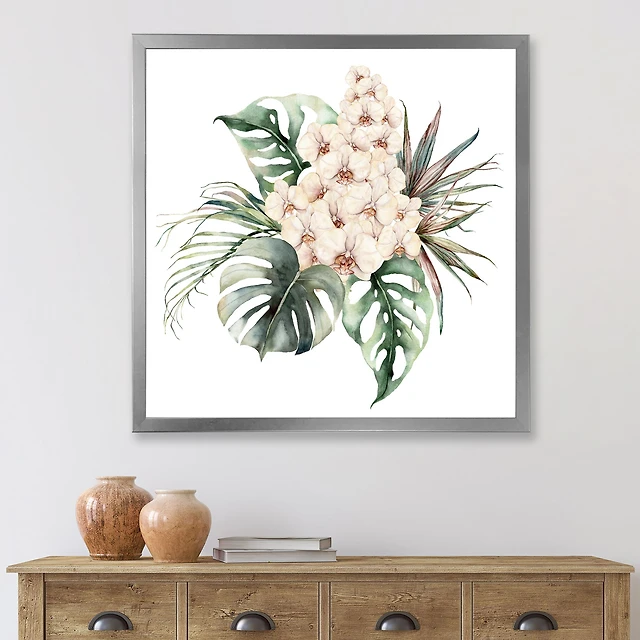 Bouquet with Orchids Monstera and Coconut Leaves Canvas Wall Art Print