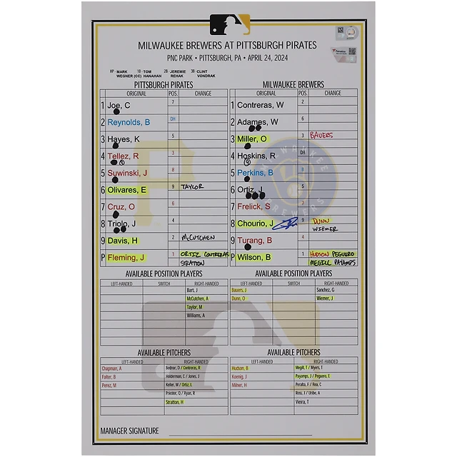 Jackson Chourio Milwaukee Brewers Autographed Game-Used Lineup Card vs. Pittsburgh Pirates on April 23, 2024