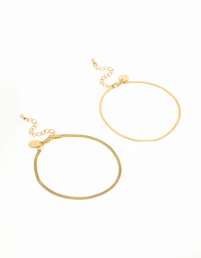 Waterproof Gold Plated Stainless Steel Mixed Snake Chain Anklets 2-Pack