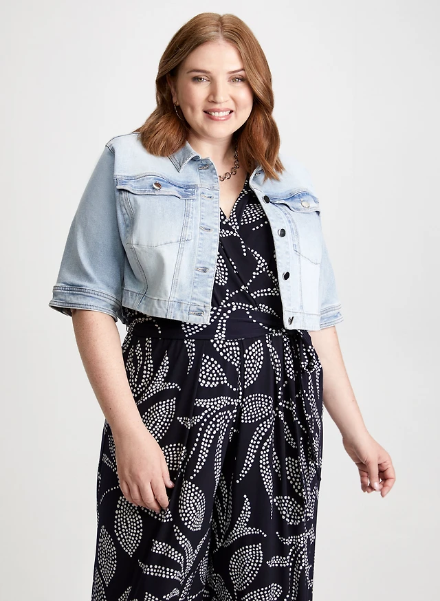 Cropped Denim Jacket & Leaf Print Jumpsuit