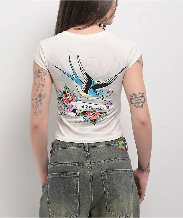 Ed Hardy Twice Shy Rhinestone Arctic Blue Crop T-Shirt
