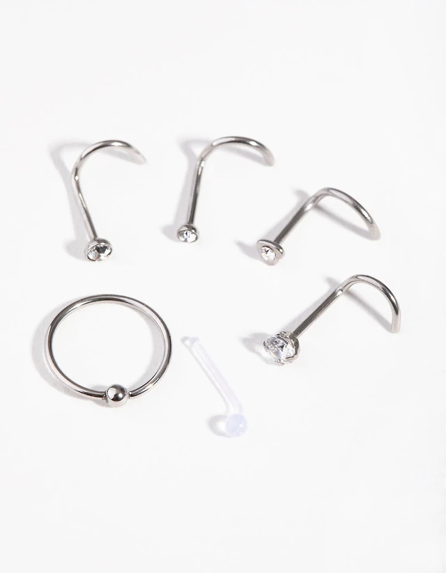 Surgical Steel Mixed Diamante Nose Stud & Ring 6-Pack