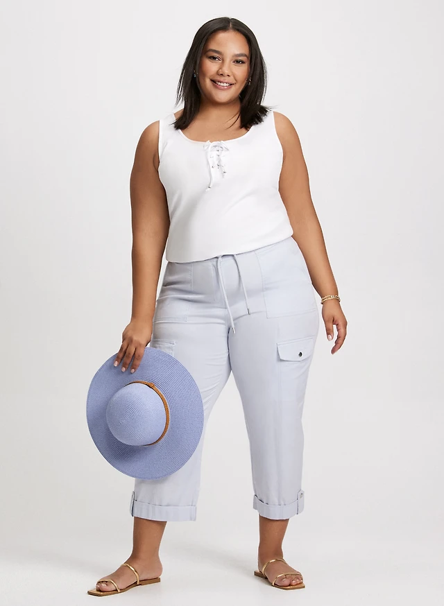 Lace-Up Ribbed Tank & Cotton Drawstring Waist Cargo Capris
