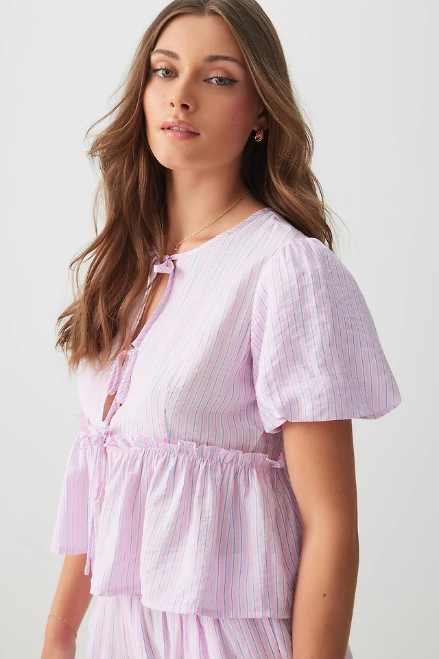 Foil Flower Print Cotton-Blend Drawstring Side Short Sleeve Top by Froccella