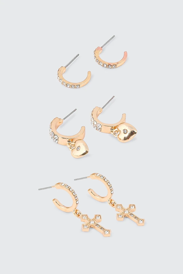 Gold Heart Diamante Stud Earring 3-Pack