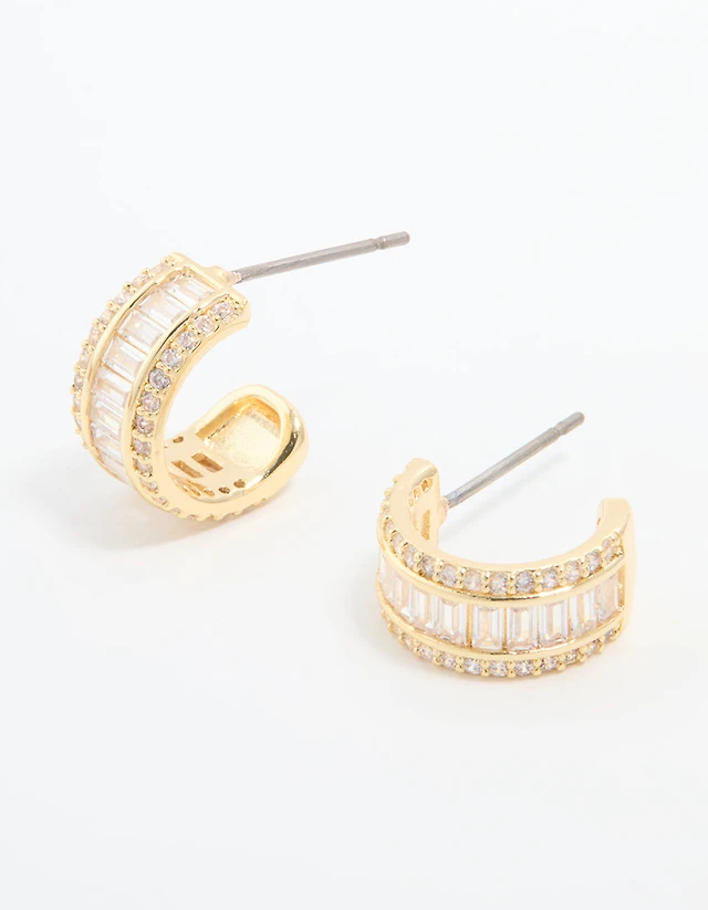 Gold Plated Cubic Zirconia Baguette Small Hoop Earrings