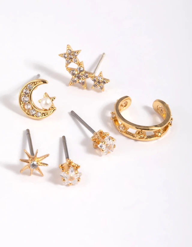 Gold Plated Brass Cubic Zirconia Chain & Stud Earrings 3-Pack
