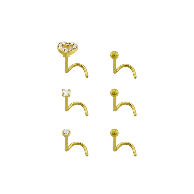 Multi-Pack CZ Goldplated Stone Heart Corkscrew Nose Rings 6 Pack - 20 Gauge