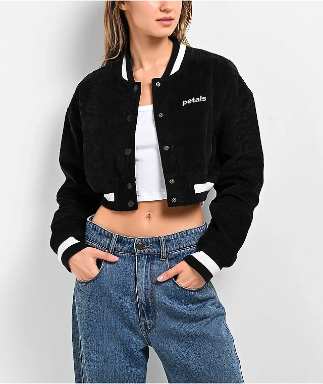 Petals by & Peacocks Billie Black Corduroy Crop Varsity Jacket