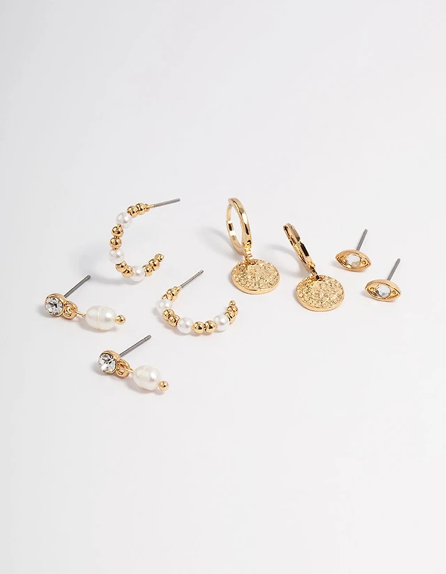 Gold Plated Brass Pearl Stud & Drop Earrings 4-Pack