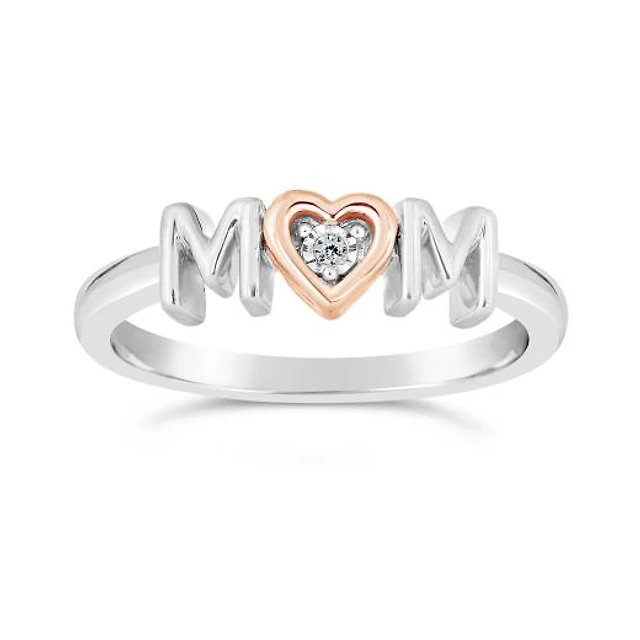 Sterling Silver 10K Rose Gold Diamond Mom Heart Ring