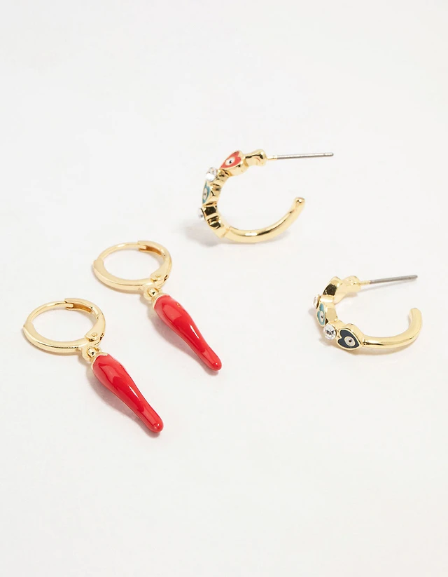 Gold Plated Evil Eye & Chilli Hoop Earrings 2-Pack