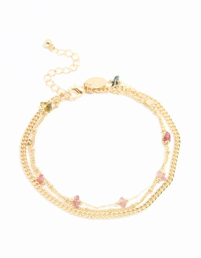 Waterproof Gold Plated Stainless Steel Rose Quartz Semi Precious Stone Chip Bracelet