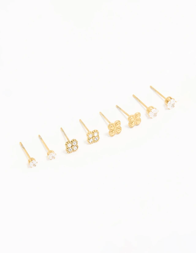 Waterproof Gold Plated Stainless Steel Cubic Zirconia Flower & Classic Stud Earrings 4-Pack