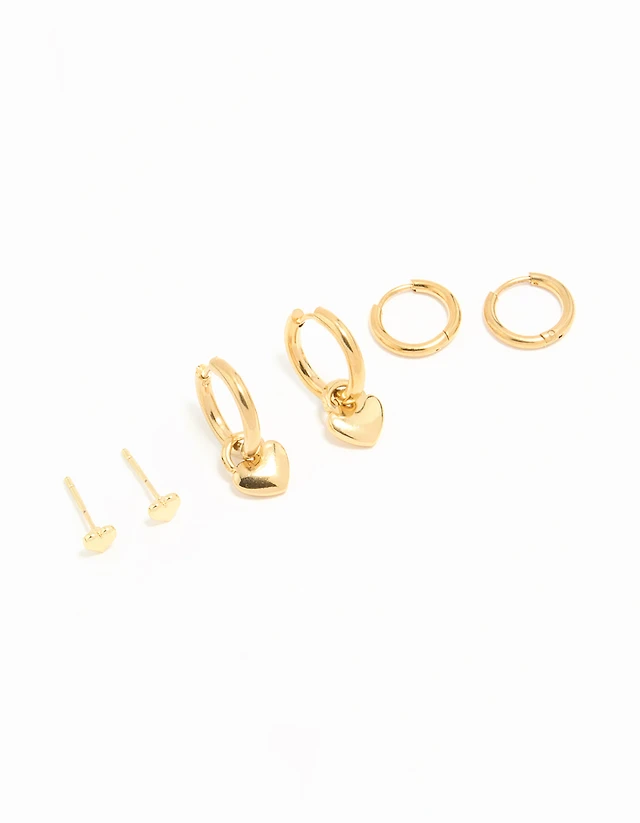 Waterproof Gold Plated Stainless Steel Heart Huggies & Classic Stud Earrings 3-Pack