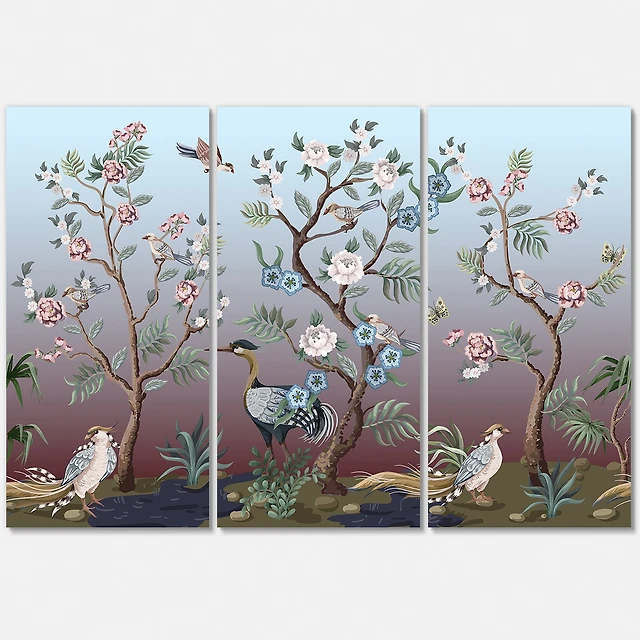 Chinoiserie with Birds and Peonies XI Canvas Wall Art - 3 Panels