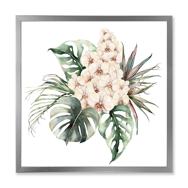 Bouquet with Orchids Monstera and Coconut Leaves Canvas Wall Art Print