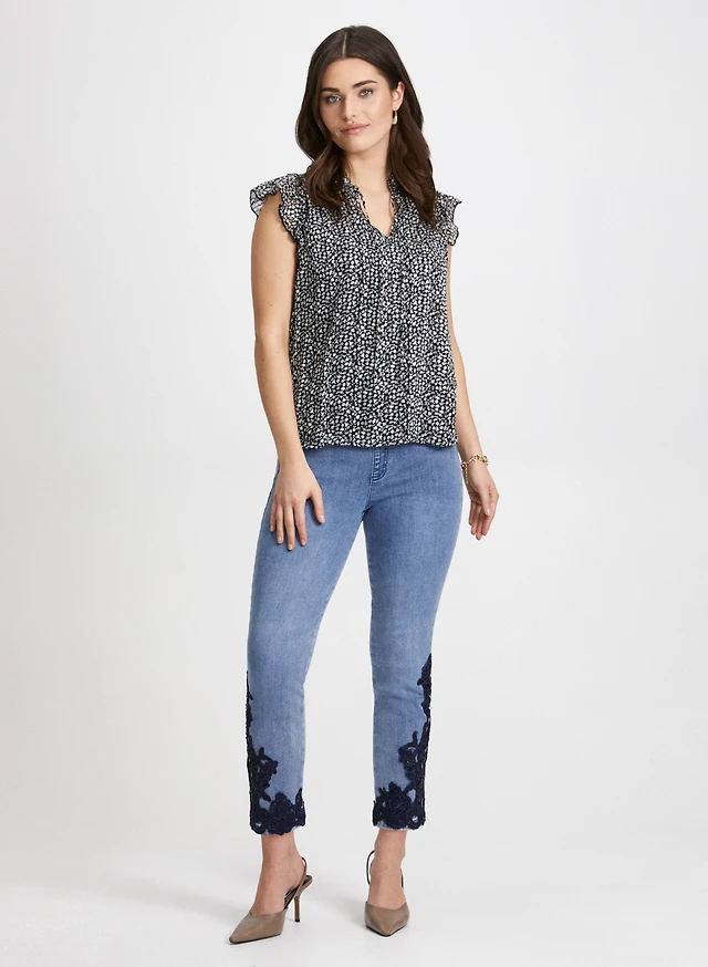 Embroidered Bouffant Sleeve Blouse & Lace-Hem Denim Capris