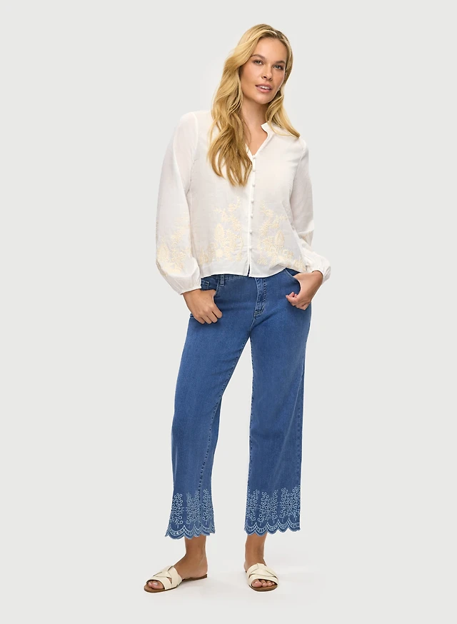Button Down Blouse & Embroidered Capri Jeans