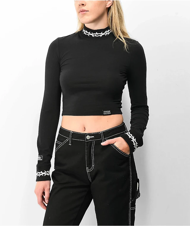 Ardene Washed Long Sleeve Ultra Crop Top in Black | Size Large | Cotton/Elastane