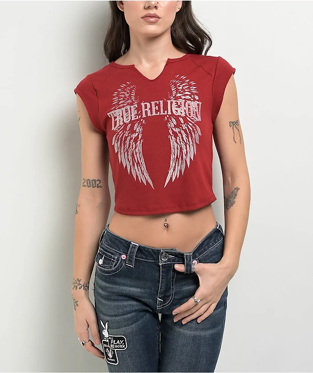 True Religion Crystal Wing Notch Rib Red Crop T-Shirt
