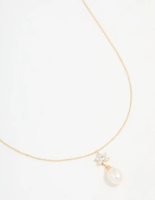 Gold Cubic Zirconia Flower & Pearl Drop Earrings